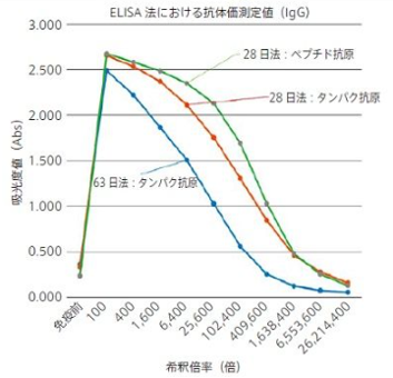 A. 株式会社ホクドーが提供する28日法では、右図の用に28日法においてもペプチド抗原で抗体価が上昇していることがELISAで確認されています。